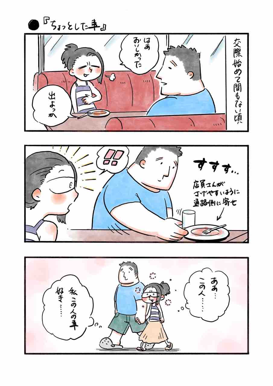 恋人にしろ友人にしろ、こういう『ちょっとした事』で一気に好きになる事ありますよね。旦那は結婚した今も外出先でやってるから、パフォーマンスじゃなくて本当に素朴な思いやりでやってるんだと思います。初めて見たときは本当に素敵だと思ったし育ちの良さを感じたなぁ。