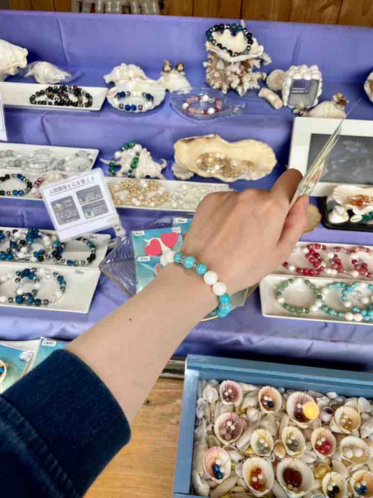 帰りに『ビーチサイド』でオーダーメイドブレスレットを旦那からプレゼントしてもらいました🥰最初は紺碧の琉球ガラスで沖縄の深い海をイメージしたの作ろうと思ったんですが、この旅行中ずっと曇ってたので、あえてそのイメージで白珊瑚とターコイズをチョイス☁️